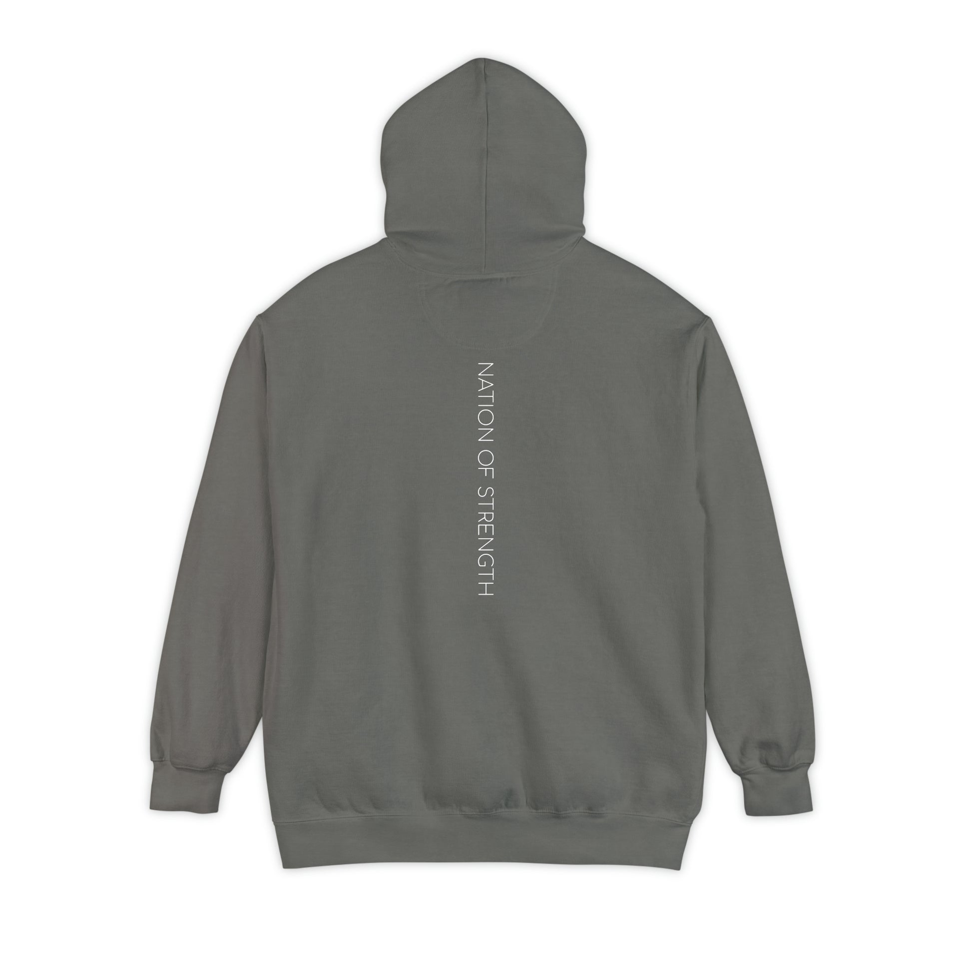 Your standard Nation of Strength (NoS) unisex hoodie, at your service. Featuring our mountain logo on the front and name at a 90 degree angle down the back. Thank you for walking with us and our brand! Printed on your personal favorite - Comfort Colors.